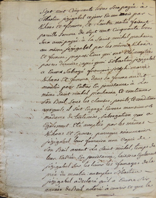 sept cent cinquante livres sera payée à Sébastien Jézégabel ce jour en un mois par Kerhoas et femme, et l'autre moitié faisant pareille somme de sept cent cinquante livres sera aussi payée à la saint Michel prochaine au même Jézégabel par les mêmes Kerhoas et femme, propositions qui ont été acceptées par ces derniers ; après quoi Sébastien Jézégabel a encore subrogé François Jpseph Marie Kerhoas et femme dans sa ferme audit moulin pour entrer en jouissance à la même saint Michel prochaine, et continuer son bail sous les clauses, points et conditions auxquels il soit engagé envers Monsieur et Madame de Tinténiac, subrogation qui a également été acceptée par les mêmes Kerhoas et épouse, parce que Jézégabel leur fournira une copie de son bail avant la saint Michel, temps de leur entrée en jouissance, laissera également Jézégabel sur les lieux les fourages de l'année du moulin ; au surplus Sébastien Jézégabel a déclaré qu'il a encore six années de bail notarié à courir et que le