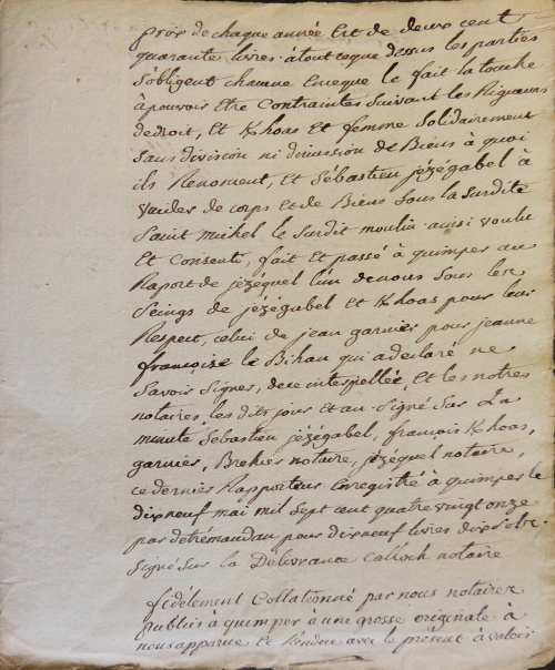 prix de chaque année est de deux cent quarante livres. A tout ce que dessus les parties s'obligent chacune en ce que le fait la [...] à pouvoir être contrainte suivant les Régaires [2] de droit, et Kerhoas et femme solidairement sans division ni discussion de biens à quoi ils recoivent, et Sébastien Jézégabel à [...] de corps et de biens sous la susdite saint Michel le susdit moulin ainsi voulu et consenti, fait et passé à Quimper au raport de Jézéquel l'un de nous sous les seings de Jézégabel et Kerhoas pour leur respect, celui de Jean Garnier pour Jeanne Françoise Le Bihan qui a déclaré ne savoir signer, de ce interpellée, et les notres notaires, les dits jour et an signé sur ka minute Sébastien Jézégabel, François Kerhoas, Garnier, Bréhier notaire, Jézéquel notaire, ce dernier rapporteur. Enregistré à Quimper le dix neuf mai mil sept cent quatre vingt onze par Detrémandan pour dix neuf livres dix sols signé sur la délivrance Calloch notaire.