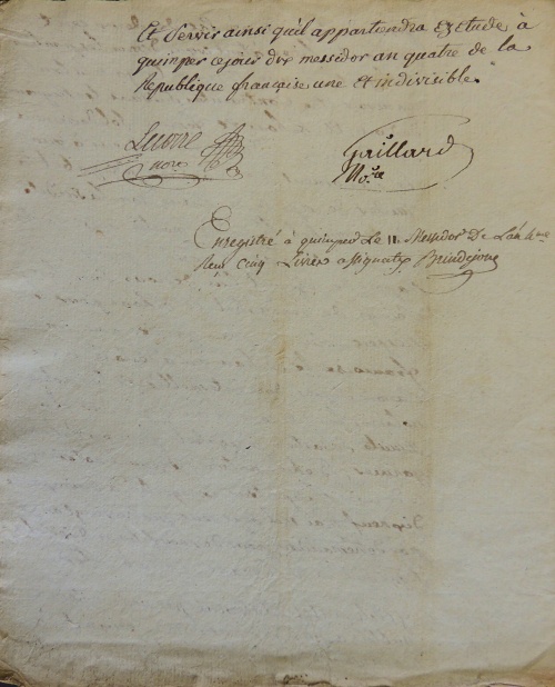 Enregistré à Quimper le 11 Messidor de l'an 4eme, reçu cinq livres assignats. Brindejonc.