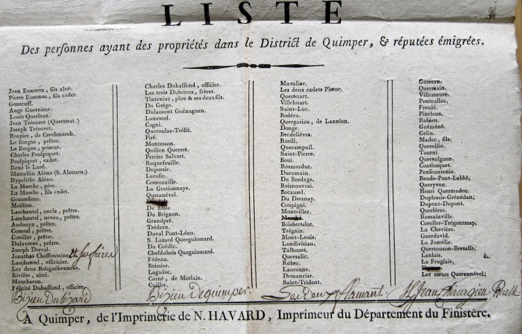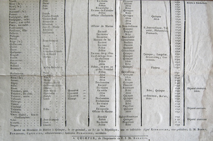 Arrêté en Directoire de District à Quimper, le 27 germinal, an 3e de la République, une et indivisible, Signé Kernafflen, vice-président ; L. M. Bonet, Bararzer, Capitaine, administrateurs ; Ambroise Duhaffond, secrétaire. A Quimper, de l'Imprimerie de P.J.M. Barazer.