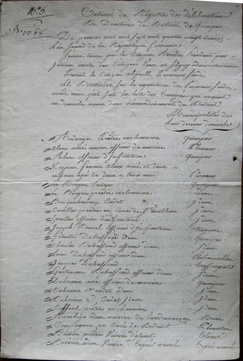 Extrait du registre des délibérations du Directoire du District de Quimper.