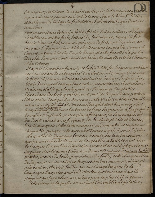 D'après cette explication du domaine congéables & de son origine, sur laquelle nous ne craignons pas d'être contredits, il est évident qu'on en a imposé à l'Assemblée Législative, quand on lui a dit que cette tenure participoit de la nature des fiefs. On ne peut participer de ce qui n'existe pas, le domaine congéable a pris naissance, comme on vient de le voir, dans le quatrième ou cinquième siècle, & tout le monde fait que la féodalité ne s'est introduite que dans le neuvième.