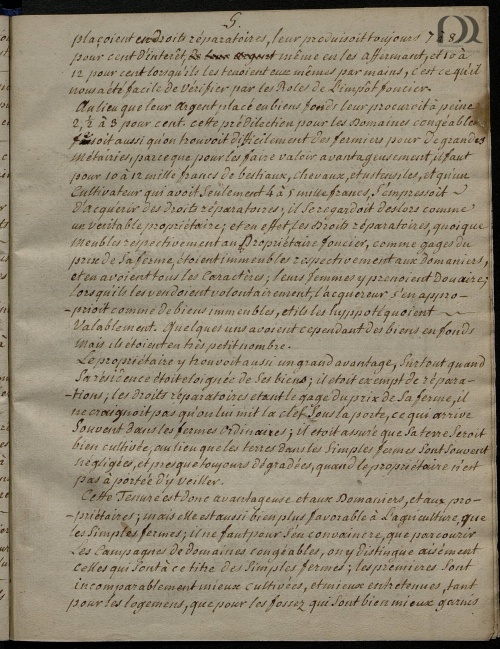 Le propriétaire y trouvoit aussi un grand avantage, surtout quand sa résidence étoit éloignée de ses biens ; il étoit exempt de réparations ; les droits réparatoires étant le gage du prix de fa ferme, il ne craignoit pas, qu'on lui mit la 'clef fous la porte, ce qui arrive couvent dans les fermes ordinaires ; il étoit assuré que fa terre seroit bien cultivée, au lieu que les terres dans les smples fermes sont souvent négligées & presque toujours dégradées quand le propriétaire n'est pas à portée d'y veiller.
