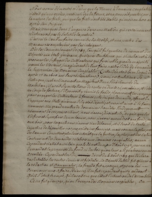 Dès les commencemens de 1789, lorsqu'il fut question de nommer des Députés aux Etats-Généraux, quelques ambitieux, qui cherchoient à se procurer les suffrages des cultivateurs qui fesoient la grande majorité parmi les Electeurs, imaginèrent de leur faire naître l'idée de demander la suppression des Domaines congéables. [ Cette idée étoit bien singulière après 13 ou 1400 ans sans réclamations. ] Parmi ces ambitieux se distingua particulièrement un Magistrat d'une Sénéchaussée du Morbihan ; il avoit six mille livres de rentes en droits réparatoires, & c'étoit un coup de fortune, s'il pouvoit y réunir le fonds. Il parcourut les campagnes pour engager