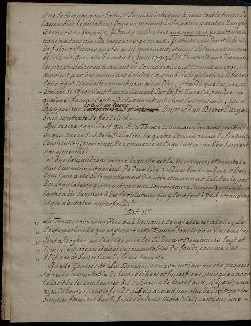 Qui croira cependant que, si la Tenure convenancière avoit participé en quoi que ce soit de la féodalité, les quatre Comités réunis de féodalité, Constitution, Domaines, de Commerce & d'Agriculture ne s'en seroient pas apperçûs ?