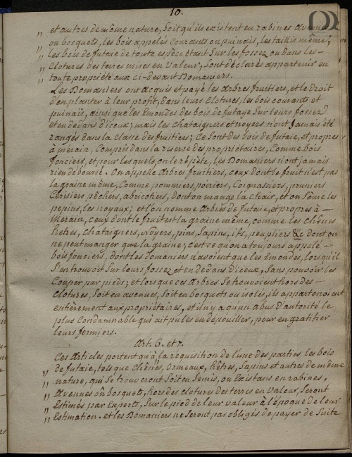 « Tous les arbres fruitiers, tels que pommiers, châtaigniers, noyers & autres de même nature, soit qu'ils existent en rabines, avenues ou bosquets, les bois appelés courants ou puinais, les taillis même, les bois de futaie de toute espèce étant sur les fossés ou dans les clôtures des terres mises en valeur, sont déclarés appartenir en toute propriété aux ci-devant Domaniers. »