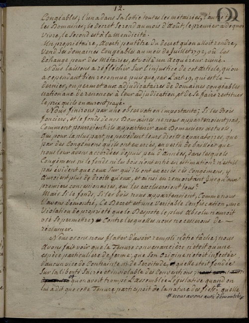 Nous laissons à réfléchir fur l'injustice de cet article, qu'on a cependant bien reconnue puisque, par l'article XIX qui est le dernier, on permet aux adjudicataires de Domaines congéables nationaux de renoncer à leur adjudication & de le faire restituer le prix qu'ils en auront payé.