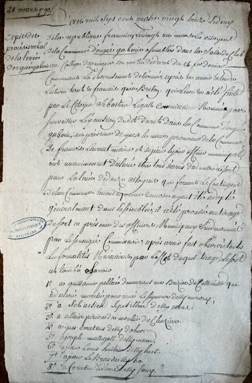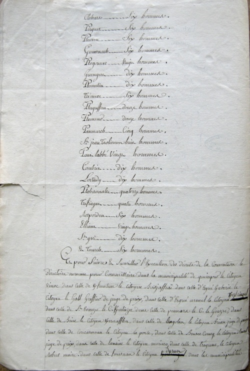 Trois documents conservés aux Archives Départementales du Finistère sous la cote 14 L 27. Ces documents sont relatifs à la contribution locale à la levée nationale des 300.000 hommes suite à la loi du 24 février 1793 votée par la Convention et défendue énergiquement par Danton. L'année précédente, le gouvernement révolutionnaire avait proclamé la patrie en danger, et lancé un appel aux volontaires. Ceux-ci, aux côtés des vétérans de l’ancienne armée royale, remportent des victoires, mais elles ne suffisent pas à ramener la paix. En 1793 tous les hommes valides de 18 à 40 ans sont potentiellement réquisitionnés. Dès le 9 mars des représentants sont envoyés en mission dans les différents départements pour accélérer cette levée. Le premier document, daté du 21 mars 1793, donne la liste des 12 gabéricois désignés par tirage au sort pour faire partie du contingent national. Trois élus surveillent la procédure de tirage : Yves Le Meur procureur de la commune, François Laurent À noter que parmi les conscrits, deux d'entre eux sont de jeunes meuniers qui, du fait sans doute de leur robuste constitution, formaient souvent des candidats idéaux pour grossir les rangs de l'armée, comme cela se remarquera de nouveau à la conscription de l'an 7. Le deuxième document est la délibération du Directoire de District de Quimper où sont notés les nombres d'hommes à fournir par commune. Le nombre requis pour la commune de Briec semble plus important que dans les autres communes. |