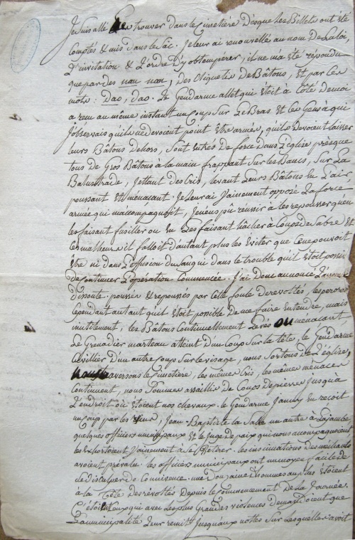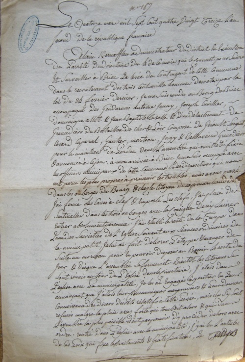 Dans le troisième document relatif à Briec qui nous apprend comme se passe la procédure de désignation, on remarque une résistance locale des habitants face aux autorités en charge de la réquisition : « Je compte sur la liste le nombre des citoyens qui devaient concourir à cette levée, ils sont au nombre de 369, je fais 333 billets blancs et 36 billets noirs (...) Il se fait un grand mouvement dans l'assemblée (...) Un grand nombre dans l'église en sortent tout à coup et se réunissent de nouveau aux opposants du dehors (...) Je leur ai renouvelé au nom de la loi l'invitation et l'ordre d'y obtempérer, il ne m'a été répondu que par des nan, nan, des cliquetis des bâtons, et par les mots : Dao, Dao. Le gendarme Allet qui était à côté de moi a reçu au même instant un coup sur les bras. ». |