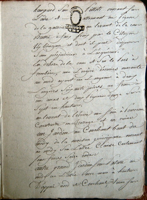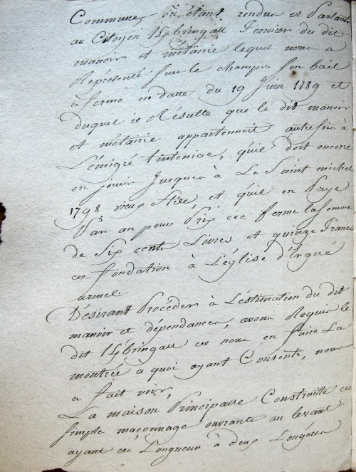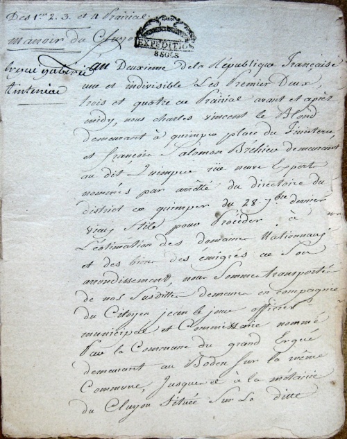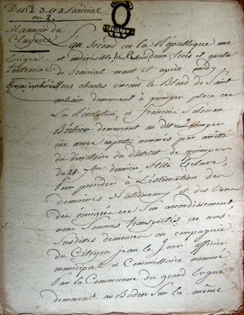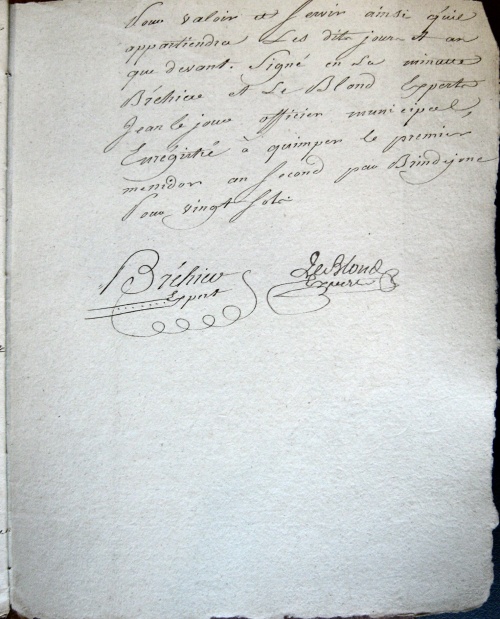 L'an second de la République une et indivisible, les premiers, deux, trois et quatre de prairial avant et après midy, nous Charles Vincent le Blond de Saint-aubain demeurant à Quimper place de la Révolution et François Salomon Bréhier [8] demeurant au dit Quimper, rue Neuve, experts nommés par arrêté du directoire du district de Quimper du 28 septembre dernier, stile esclave [9], pour procéder à l'estimation des domaines nationnaux et des biens des émigrés de son arrondissement, nous sommes transportés de nos susdites demeures en compagnie du citoyen Jean Le Jour officier municipal et commissaire nommé par la commune du grand Ergué, demeurant au Boden sur la même