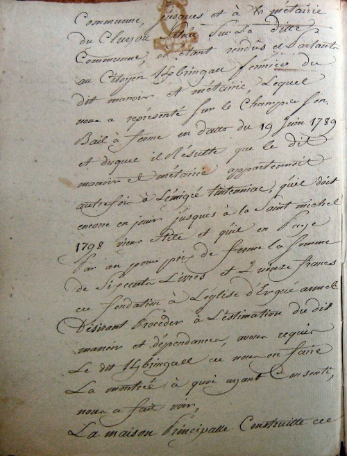 commune, jusques et à la métairie du Cluyou située sur la ditte commune, où étant rendus et parlant au citoyen Kerbringall fermier du dit manoir et métairie, lequel nous a présenté sur le champ son bail à ferme en datte du 19 juin 1789 et dequel il résulte que le dit manoir et métairie appartenait autrefois à l'émigré Tintenniac, qu'il doit encore en jouir jusques à la Saint michel 1898 même fete et qu'il en paye par an pour prix de ferme la somme de six centz livres et quinze francs en fondation à l'église d'Ergué armel. Désirant procéder à l'estimation du dit manoir et dépendances, avons requis le dit Kerbringall de nous en faire la montré à quoi ayant consenti, nous a fair voir,