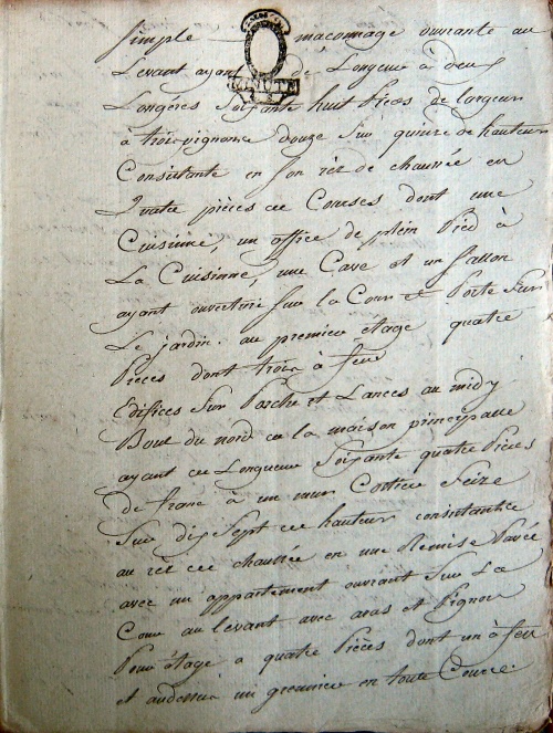 simple maçonnage [2] ouvrante au levant ayant de longueur à deux longères [10] soixante huit pieds [11], de largeur à trois pignons douze sur quinze de hauteur, consistante en son rez de chaussée en quatre pièces de courses dont une cuisinne, un office de plein pied à la cuisinne, une cave et un sallon ayant ouverture sur la cour et porte sur le jardin. Au premier étage, quatre pièces sont trois à feux.