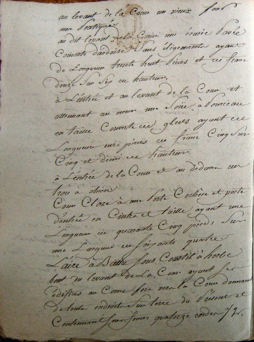 L'aire à battre sous courtil [13] à herbe bout du levant de la cour ayant ses édifices au cerne [14] fors [15] vers la cour donnant de toute endroit sur terre du présent et contenant sous fonds [16] quatorze cordes [17].