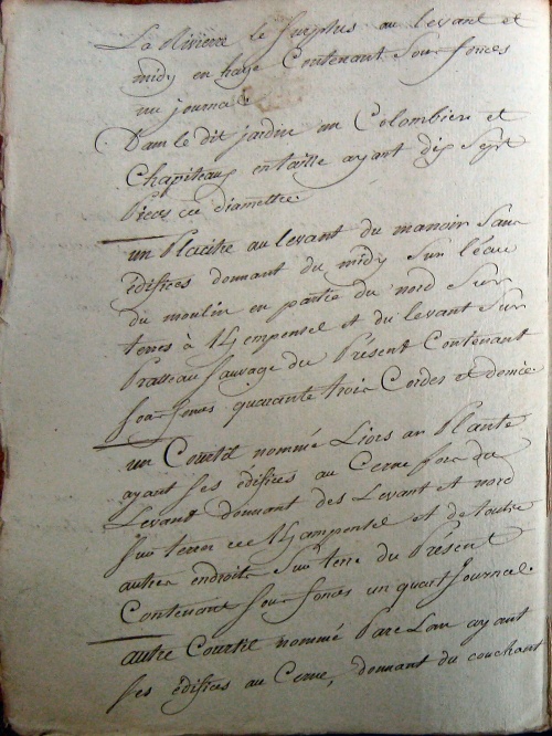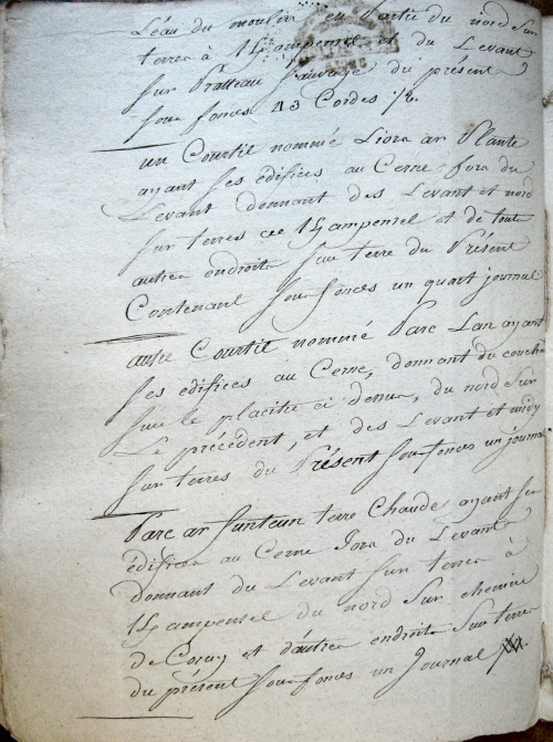 un courtil [13] nommé liorz ar Plante ayant ses édifices au cerne [14] fors [15] du levant donnant des levant et nord sur terres de Kerampensel et de toutes autres endroits sur terres du présent contenant sous fonds [16] un quart journal [20].