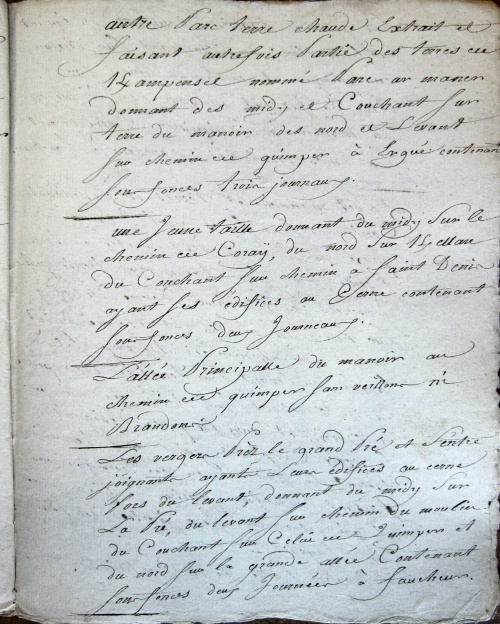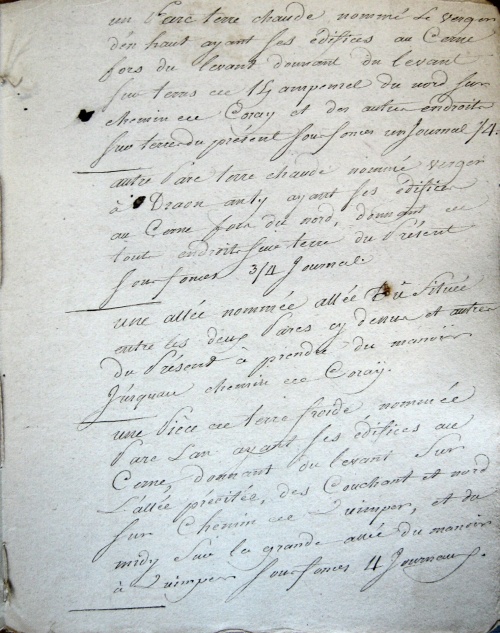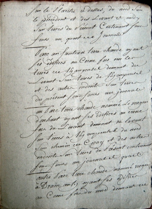 Un parc [22] terres chaudes [23] nommé le verger d'en haut ayant ses édifices au cerne [14] fors [15] du levant donnant sur terres à Kerampensel du nord sur chemin de Coray et des autres endroits sur terres du présent contenant sous fonds [16] un journal [20] et quart.