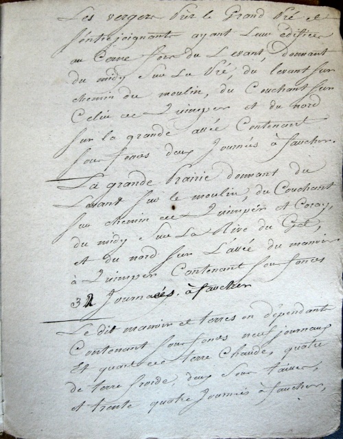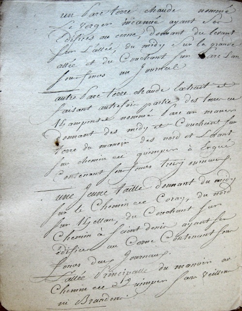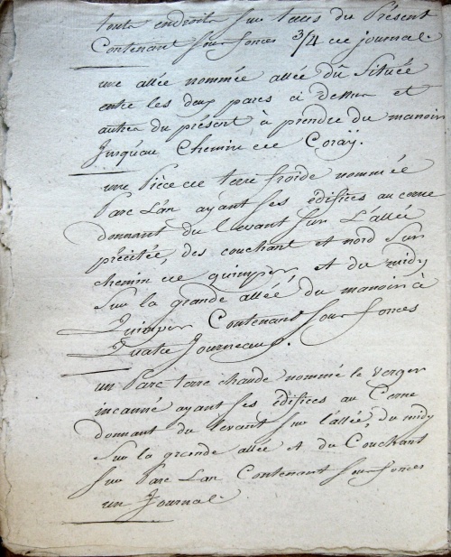 Les vergers près le grand pré et s'entrejoignant ayant leurs édifices au cerne [14] fors [15] du levant, donnant du midy sur la pré, du levant sur chemin du mouli,, du couchant sur celui de Quimper et du nord sur la grande allée contenant deux journées [20] à faucheur.