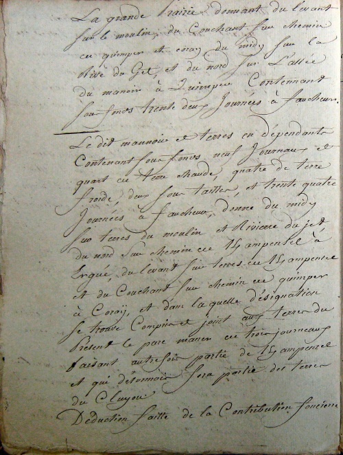 Le dit mannoir et terres en dépendants contenant sous fonds [16] neuf journaux [20] et quart de terre chaude [23], quatre de terre froide [24], deux four tailles, et trente quatre journées à faucheur, donne du midy sur terres du moulin et rivière du Jet, du nord sur chemin de Kerempensel à Ergué, du levant sur terres de Kerampensel et du couchant sur chemin de Quimper à Coray, et dans laquelle désignation se trouve compris et joint aux terres du présent le parc maner de trois journeaux [20] faisant autrefois partie de Kerampensel et qui désormais fera partie des terres du Cluyou.