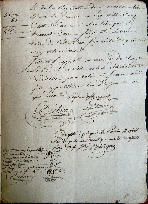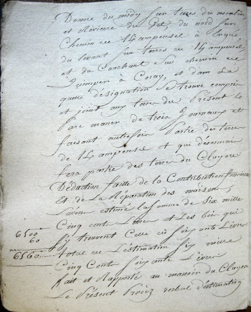 et de la réparation des maisons, l'avons estimé la somme de six mille cinq cents livres et les bois qui s'y trouvent celle de soixante livres total de l'estimation six mille cinq cents soixante livres.