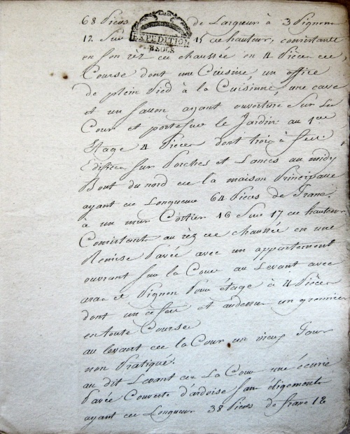 Bout du nord de la maison principalle ayant en longueur soixante quatre pieds [11] de franc [12] à un mur costié seize sur dix sept en hauteur, consistante au rez de chaussée en une remise pavée avec un appartement ouvrant sur la cour au levant avec arcs et pignon. Pour étage à quatre pièces dont un à feu et au-dessus un grenier en toute cource