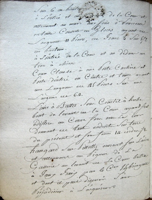 Cour close à une porte cochère et porte d'entrée en cintre et taille ayant une longueur de quarante cinq pieds [11], sur une largeur de soixante quatre.