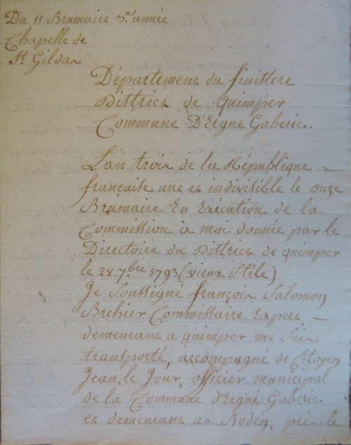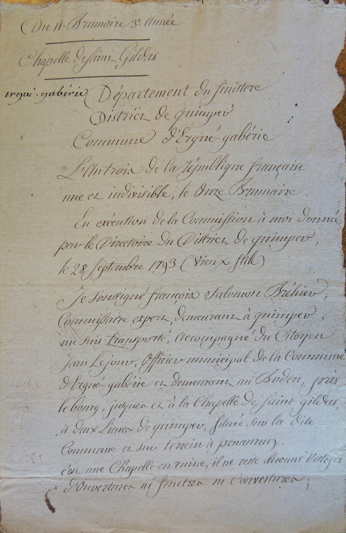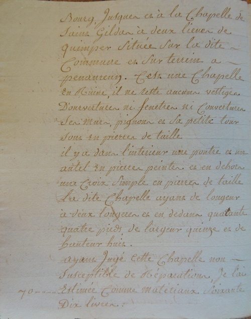 L'estimation de la valeur monétaire de St-Gildas est rédigée par Salomon Bréhier, commissaire expert de Quimper et futur maire d'Ergué-Gabéric, assisté par l'officier municipal Jean Lejour, travail effectué également pour d'autres chapelles par Jean Marie Le Roux, autre expert quimpérois. Elle est située « à deux lieues de Quimper située sur la dite commune et sur terrein à Penanreun ». Les terres de St-Gildas, près de village de Loqueltaz et pas très éloignées du bourg d'Ergué-Gabéric, sont détenues par les seigneurs de Pennarun, qui à la veille de la Révolution étaient des Geslin. Son prix estimé à 70 livres, soit 9% de la valeur de Kerdévot, est fonction du fait qu'elle est « non susceptible de réparations », et qu'elle est « ruine, il ne reste aucuns vestige d'ouvertures, ni fenêtres, ni couvertures. ». |