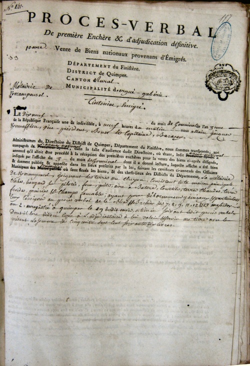 Administrateurs du Directoire du District de Quimper, Département du Finistère, nous sommes transportés, accompagnés de l'agent national, dans la salle d'audience dudit Directoire, où étant, ledit l'agent national a annoncé qu'il alloit être procédé à la réception des premières enchères pour la vente des biens ci-après désignés, indiqués par l'affiche du 11 du mois de foreal dont il a donné lecture, laquelle affiche a été bien & duement publiée et apposée dans les lieux prescrits par la loi, suivant les certificats ci-annexés des Officiers Municipaux des communes où sont situés les biens, & des chefs-lieux des Districts du Département, La métairie de Kerampensal, joignant les terres du Cluyou, consistant en la maison principale, crèches, hangard sur pilotis, four, puits, aire à battre, courtil [4], terres chaudes [5], terres froides [6], prairies et champs faucable ; ayant pour débornements [7] généraux et particuliers, ceux consignés au procès-verbal de Le Blond et Bréhier [8] des 7, 8, 9, 11, 12 & 13 messidor an 2, enregistré à Quimper le 29 dudit mois, estimés suivant ledit procès-verbal dont il sera délivré copie à l'adjudicataire à lui valoir et servir de titre avec le présent, la somme de cinq mille sept cent soixante dix livres.