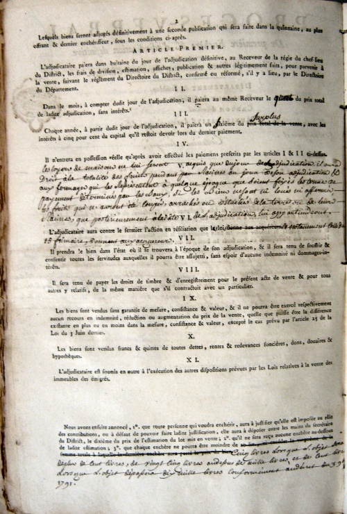 L'adjucataire paiera dans huitaine du jour de l'adjudication définitive, au Receveur de la régie du chef-lieu du District, les frais de division, estimation, affiches, publications & autres légitimement faits, pour parvenir à la vente, suivant le règlement du Directoire du District, confirmé ou réformé, s'il y a lieu, par le Directoire du Département.