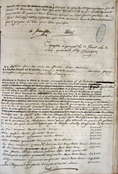 Administrateurs du Directoire du District de Quimper, accompagnés du citoyen J. J. Lebreton, Procureur-Syndic du District, nous étant rendus dans la salle d'audience, nous avons annoncé que d'après la publication faire par l'affiche du 3 germinal qui a été publiée & apposée à cet effet dans les lieux prescrits par la loi, ainsi qu'il est justifié par les certificats ci-annexés des officiers Municipaux des communes où sont situés les biens, & des chefs-lieux des Districts du Département, il allait être procédé à l'adjudication définitive de la métairie de Kerampensal provenant de l'émigré Tinteniac dont la consistance est plus au long détaillée dans le procès-verbal de 1ère criée qui a eû lieu le 19 germinal dernier ; et de suite le procureur syndic ayant donné lecture des dittes affiches du procès-verbal de la 1ère séance, les détails y portés par la consistance et les objets mis en vente, et des clauses, charges et conditions y détaillées, nous avons ouvert les enchères sur la somme de cinq mille sept cent soixante dix livres livres, qui est le montant, en conséquence nous avons fait allumer un premier feu pendant la durée duquel il a été offert