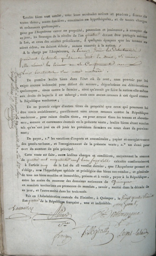 Cette vente est faite, outre lesdites charges et conditions, moyennant la somme de quatre cent cinquante neuf livres seize sols calculée conformément à l'article 5 et 6 de la Loi du 28 ventôse dernier, que l'Acquéreur promet et s'oblige, sous l'hypothèque spéciale et privilégiée des biens sus-vendus, et générale de tous ses biens meubles et immeubles, présens et à venir, payer à la République entre les mains du receveur des domaines nationaux de Quimper en mandats territoriaux ou promesses de mandats, savoir moitié dans la décade de ce jour, et l'autre moitié dans les trois mois.