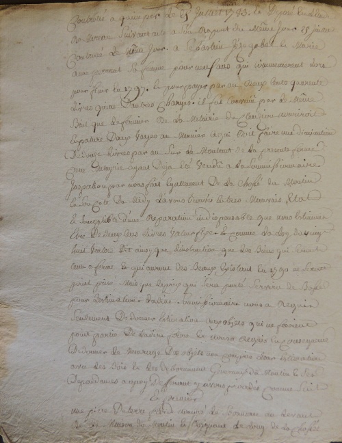 Inspection par nous fait égallement de la chossé [5] du moulin en son côté du midy l'avons trouvé en très mauvais état et susceptible d'une réparation indispensable que nous estimons être de deux cens livres valeur fixe, et comme la loy du vingt huit ventose dit ainsy qu l'ins[...] que les biens qui seront ceux à ferme et qui auront des beaux existant en 1790 ne seront point prisé, mais que le prix qui sera porté servira de base pour destination, la dite soumissionnaire nous a requis seulement de donner estimation aux objets qui ne fesoient point partie de la dite ferme et [...] requis en conséquence de donner le mesurage des objets non compris leur estimation avec des bois et des débornements [6] généraux du moulin et ses dépendances à quoy deffer[...] y avons procédé comme suit.
