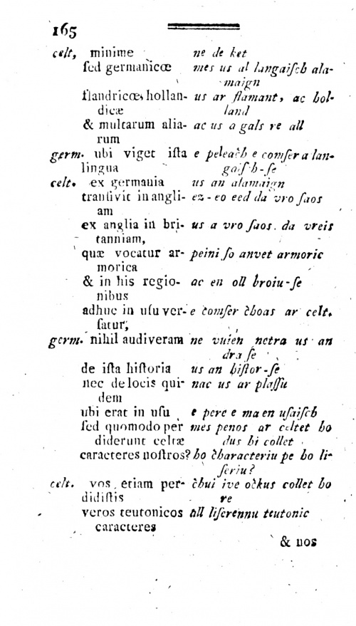 Quin imo, longe ante ante Julii Caesaris seculum, in Britannia minori vigebat celtica lingua ; cum enim Julius Caesar quamdam urbem Britanniae minoris nomine Venetensem (gallice Vannes) obsidione teneret, saepe seaudivisse testatur Celtarem clamorem istum : torr e Benn da Cesar ; quae verba significant : frange Caesaris caput ; ea de re ipse Julius Caesar in libro suo de bello gallico sic scribit : quam terribiles sunt Britones, quando dicunt : "torr e Benn da Cesar". Inde Celticam linguam ex Germania in Angliam, ex Anglia in Britanniam minorem, migrasse ante Julii Caesaris seculum, concludere pronum est.