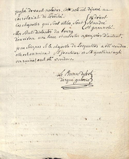 Autres lectures : « 1804 - Cession et don de la chapelle de Kerdévot à la commune » ¤ « 1804 - Affermage et conservation provisoire du presbytère » ¤ « 1807 - Reprise de la chapelle de Kerdévot par la fabrique et la paroisse » ¤ « 1809 - Attestation de quête pour l'acquisition de la chapelle de Kerdévot » ¤ « François Le Pennec, recteur-desservant (1802-1810) » ¤ « Jean-Guillaume Le Bescou, recteur-desservant (1810-1822) » ¤ « 1794-1795 - Estimation et vente de la chapelle de Kerdévot » ¤ « Espace «Biens Nationaux» » ¤