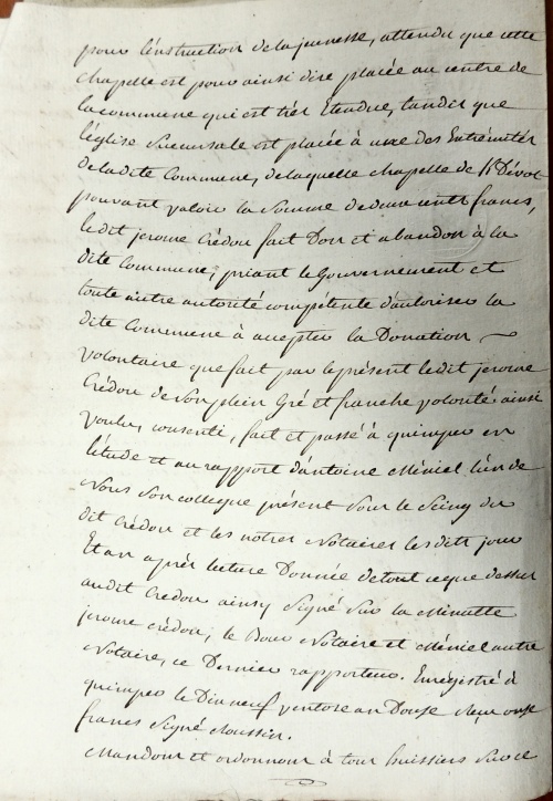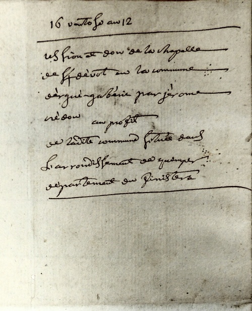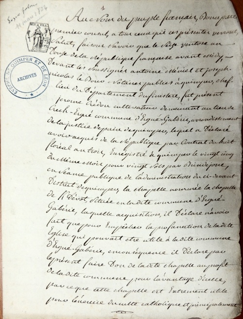 Document de cession à titre gratuit de la chapelle à la commune, suite à son acquisition en 1794 par vente aux enchères d'un bien national confisqué à l'Eglise catholique : « ledit Jérome Crédou fait don et abandon à la dite commune, priant le gouvernement et toute autre autorité compétente d'autoriser la dite commune à accepter la donation volontaire que fait par le présent ledit Jérôme Crédou de son plein gré et franche volonté ». Le document est daté du 19 ventose an douze, à savoir le 10 mars 1804. Le rédacteur de l'acte insiste sur les objectifs du donateur lorsqu'il a acheté la chapelle : « laquelle acquisition, il déclare n'avoir fait que pour empêcher la profanation de la dite Eglise qui pouvait être utile à la dite commune d'Ergué-Gabéric ». À cette époque le recteur de la paroisse, Alain Dumoulin, avait refusé de prêter serment à la Constitution civile du clergé, et avait du s'expulser à Prague en Bohême, et un curé constitutionnel avait été installé. Et pourquoi cette chapelle est importante pour la paroisse : « parce que cette chapelle est extrêmement utile pour l'exercice du culte catholique et principalement pour l'instruction de la jeunesse, attendu que cette chapelle est pour ainsi dire placée au centre de la commune qui est très étendue, tandis que l'église succursale est placée à une des extrémités de la dite commune ». Nicolas Louboutin, vicaire réfractaire de Guengat, expulsé en Espagne à la Révolution, témoigne sur les intentions initiales : « Ouelques communes, lors de la liberté, ont chassé leurs intrus. D'autres ont acheté des chapelles pour les sauver et empêcher le Constitutionnel d'y dire la