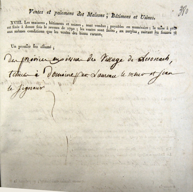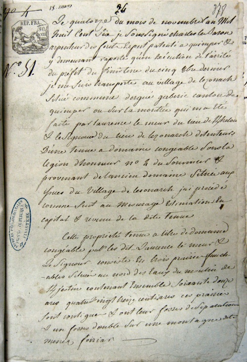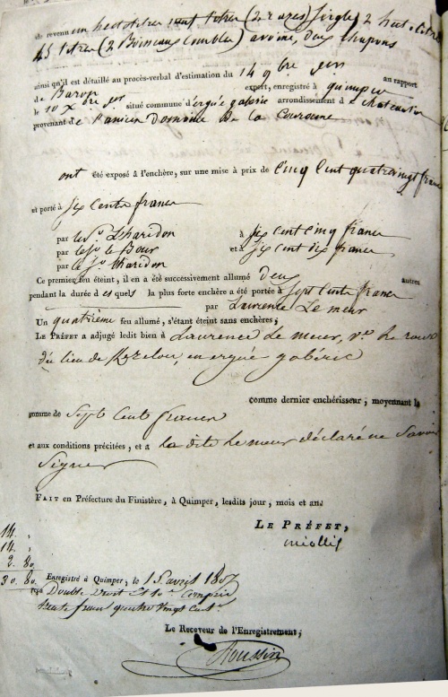 Les documents de cette vente de 1807 sont conservés des Archives Départementales de Quimper sous la côte 1Q1107-107. Il s'agit d'une vente de tenue en guise de fin d'affectation au domaine agricole de l'Ordre de la Légion d'honneur. |