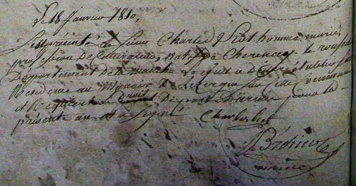- Charles Liot est né le 01/05/1770 à Chérencé-le-Roussel, épouse Marie Jeanne Dubois le 28 juillet 1806 à Chérancé. Ont un fils François né en 1808 à Chérencé, et deux filles et un fils nés à Lezergué entre 1811 et 1816. Décédé le 13 février 1831 à Ergué-Gabéric. Cultivateur à Lezergué et surnommé le Sieur Charles Jean dans les actes (sources généalogiques de Nicole Le Grand, Vincent Rocard et d'Henri Chauveur). [Ref.↑]