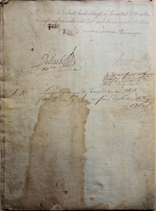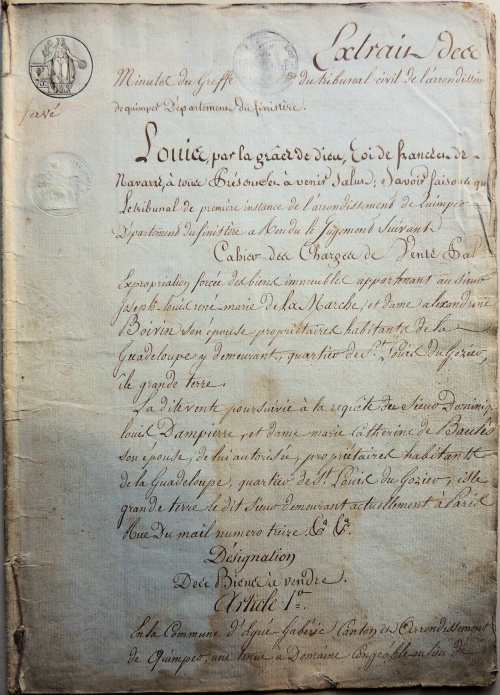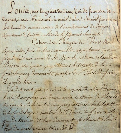 Le document de 1809 ci-contre démarrant par un « Louis, par la grâce de Dieu, roi de France et de Navarre », cela ne veut pas dire que Louis XVIII est déjà sur le trône, mais que l'extrait a été demandé sept ans plus tard pour authentifier la succession suivante. Les biens fonciers de Lezergué et de Kerdudal sont restés sous la coupe de leurs propriétaires fonciers de La Marche, pendant tout le 18e siècle jusqu'en 1808-09, en échappant aux confiscations révolutionnaires. En effet ces propriétés n'ont pas été vendues comme biens nationaux comme l'ont été en 1795-97 tous les autres biens nobles et ecclésiastiques d'Ergué-Gabéric. Le manoir et ses mouvances sont restés la propriété de la famille de La Marche, malgré le fait que les chefs de famille (François-Louis de La Marche père et son fils cadet Joseph-René-Louis-Marie) sont réputés absents et exilés. L'absence de vente est surprenante car ces deux nobles sont installés en Guadeloupe à l’île Grand Terre et leurs terres sont nombreuses à Ergué-Gabéric. Un premier élément de réponse est l'action de Joseph-Hyacinthe de La Marche, plus jeune fils resté à Quimper, qui se rapprocha des autorités révolutionnaires, et qui conserva certains biens gabéricois dont le domaine congéable voisin de Kerveady. Un deuxième point important est l'installation et le mariage outre-mer bien avant la Révolution du fils cadet Joseph-René-Louis-Marie, officier des dragons, son père l'ayant rejoint que plus tard. Nommé En 1792, le couple guadeloupéen s'endette en achetant une habitation située en quartier du Gozier à la Guadeloupe moyennant la somme de 700 000 livres |