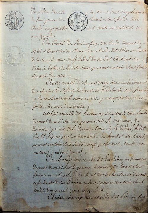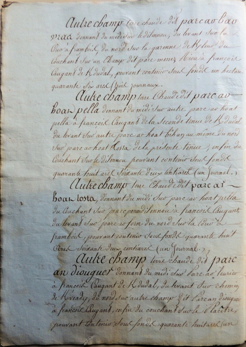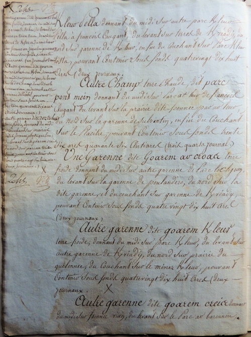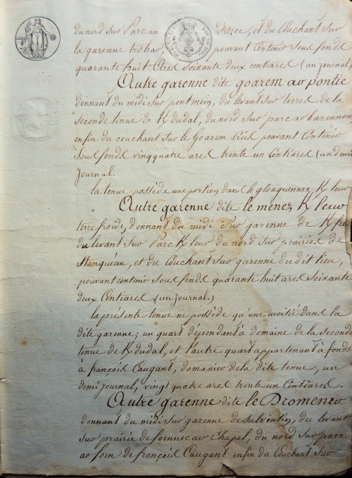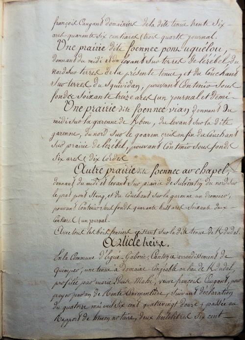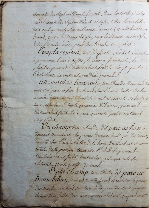 Le document de 1809 donne le montant précis des rentes dues par les fermiers à leurs propriétaires, en argent et en nature (froment, seigle et avoine), et avec les anciennes et nouvelles mesures, ce qui permet d'avoir le taux exact de conversion des boisseaux Le rapport de la vente aux enchères, long de 20 pages, décrit et localise précisément toutes les parcelles de Kerdudal :