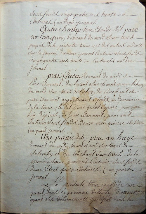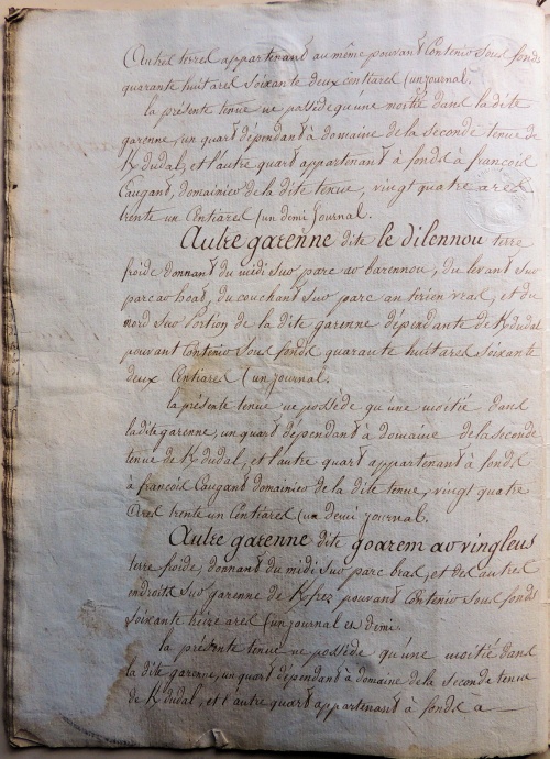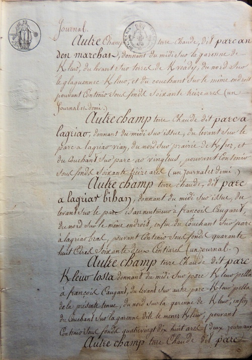 - Journal, s.m. : ancienne mesure de superficie de terre, en usage encore dans certains départements et représentant ce qu'un attelage peut labourer dans une journée. Le journal est la principale unité de mesure utilisée dans les inventaires pour calculer les surfaces des champs cultivés. Dans la région quimpéroise un journal vaut 48,624 ares, à savoir 80 cordes, soit environ un demi-hectare. Pour les jardins et les courtils on utilise le terme de « journée à homme bêcheur » correspondant à un 8e de journal ou 6 ares. Les surfaces des prés se mesurent en « journée à faucheur » ou « à faucher » équivalente à 2 journaux de laboureur, soit presque un hectare. [Terme] [Lexique] [Ref.↑ 5,00 5,01 5,02 5,03 5,04 5,05 5,06 5,07 5,08 5,09 5,10 5,11 5,12 5,13 5,14 5,15 5,16 5,17 5,18 5,19 5,20 5,21 5,22 5,23 5,24 5,25 5,26 5,27 5,28 5,29 5,30 5,31]