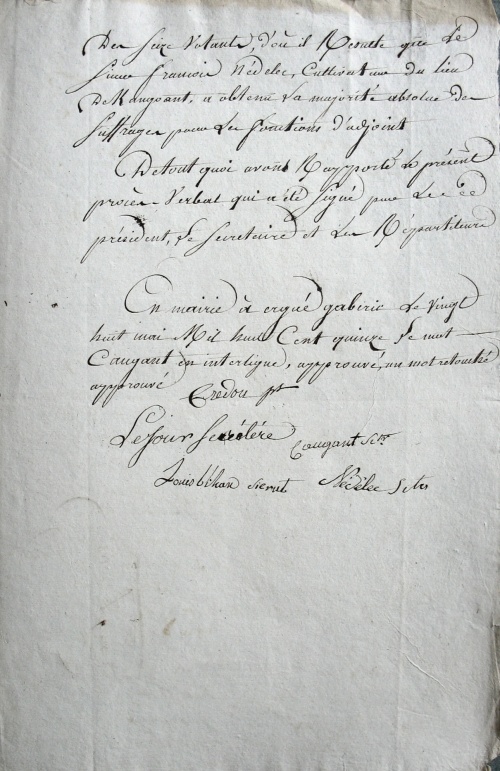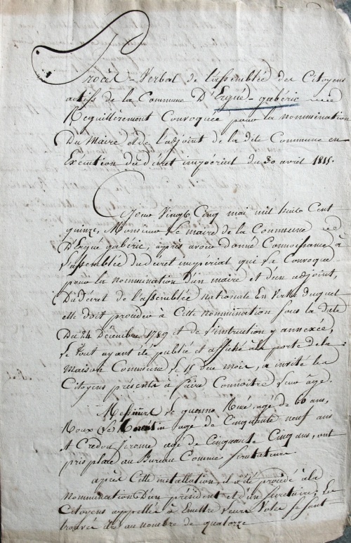 Ce document [1] daté du 25.05.1815 conservé aux Archives Départementales de Quimper, sous la côte 3 M 12, nous éclaire sur le déroulé d'une élection censitaire d'un maire gabéricois à la fin de l'empire napoléonien (période dite des "100 jours" [2]) :