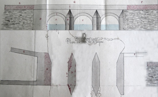 Le plan indique les parties mauvaises, elles sont teintes en rouge. La pille B devant être refaite, ainsi que la voûte A, cet ouvrage nécessitera la démolition, jusqu'à la naissance du cintre de la voûte C qui ne pourrait se soutenir une fois la culée démolie.
