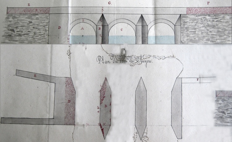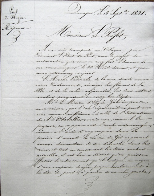 Je me suis transporté au Cluyou, pour examiner l'état du pont, avec le projet de restauration que vous m'avez fait l'honneur de me communiquer le 23 août dernier, et que vous retrouverez ci-joint.