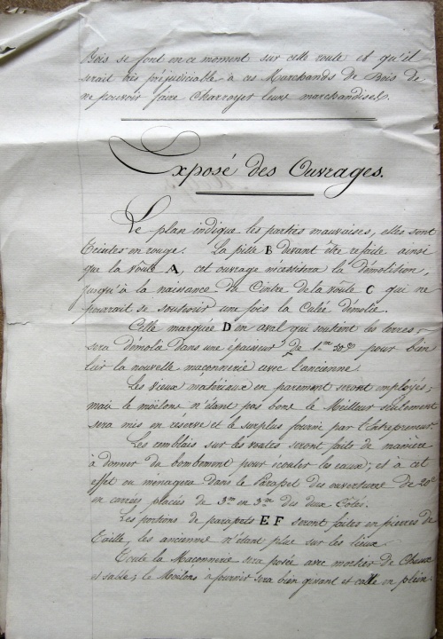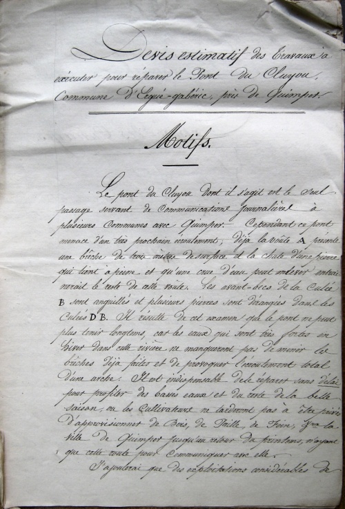 Mr le maire d'Ergué-gabéric, commune de la situation du pont a fait dresser par le sieur Chevallier un devis estimatif de la réparation, qui est extrêmement urgente, attendu qu'il est effectué en ce moment, par cette route, de nombreux charrois de bois, qui ne peuvent que hâter la chute totale de la tête du pont, et occasionner quelque malheur.