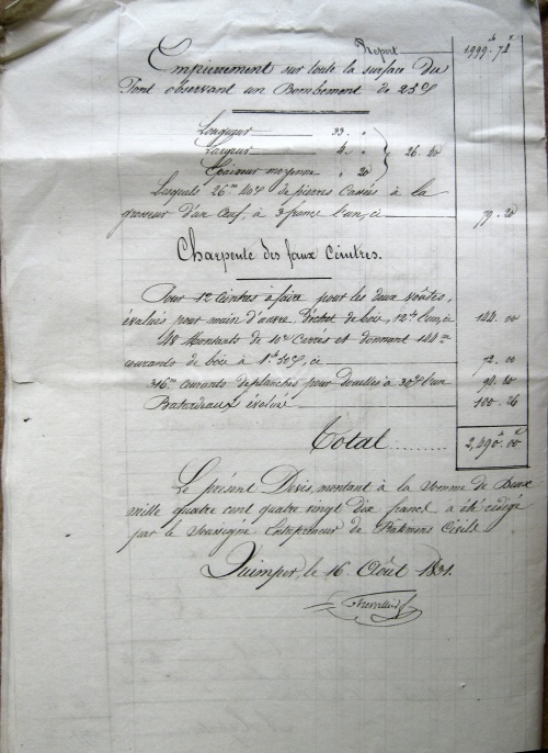 Le projet du sieur Chevallier, en admettant tous les ouvrages qu'il comprend, est estimé 2490 francs, somme beaucoup trop élevée : car, en me rendant compte des détails, je trouve que l'estimation devrait être réduite à 1900 francs, susceptibles encore de la concurrence d'une adjudication.