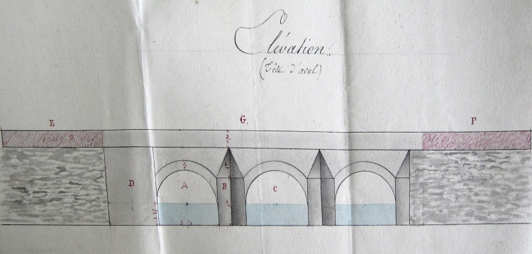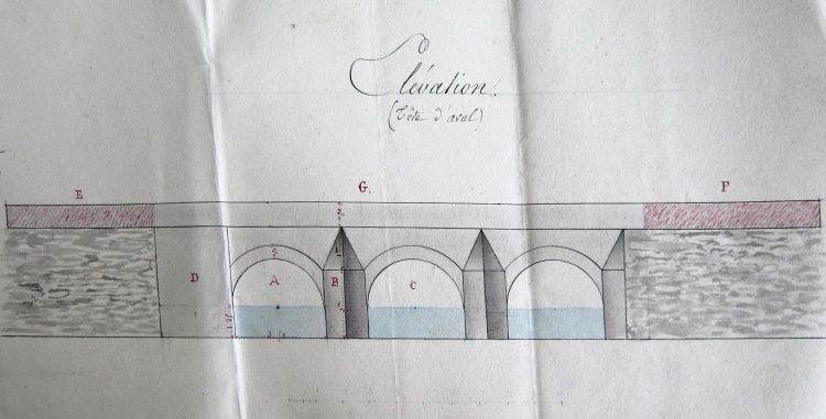 L'arche latérale de la rive droite menace ruine évidemment, ainsi que les flancs de la pile et de la culée adjacentes ; les deux autres arches paraissent en assez bon état.