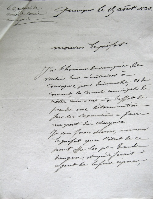 J'ai l'honneur de vous prier de vouloir bien m'autoriser à convoquer, pour dimanche 21 du courant, le Conseil municipal de notre commune à l'effet de prendre une détermination pour les réparations à faire au pont du Cleuyou.