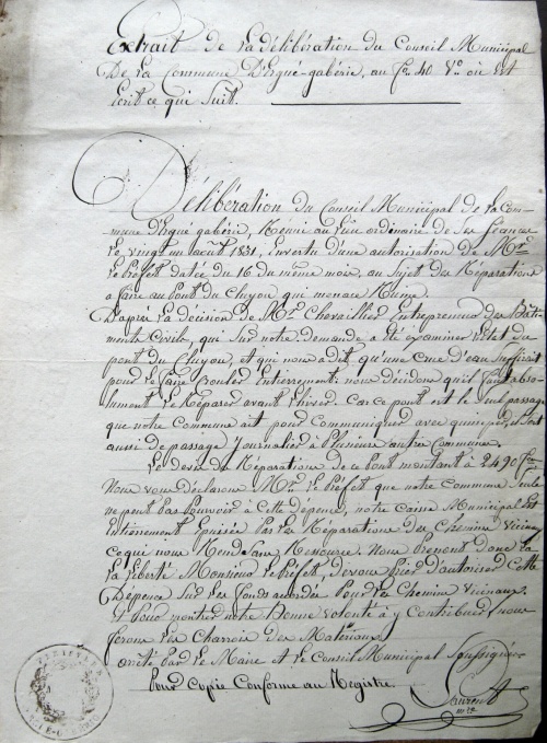 Délibération du Conseil municipal de la commune d'Ergué-Gabéric, réuni au lieu ordinaire de la sa séance le vingt et un août 1831, en vertu d'une autorisation de Mr le Préfet datée du 16 du même mois, au sujet des réparations à faire au pont du Cleuyou qui menace ruine.