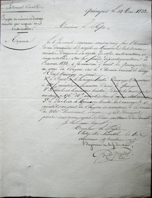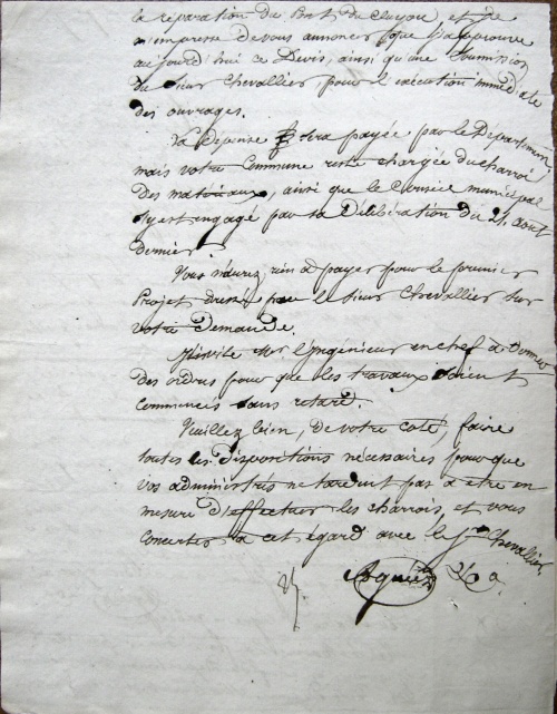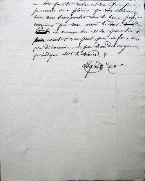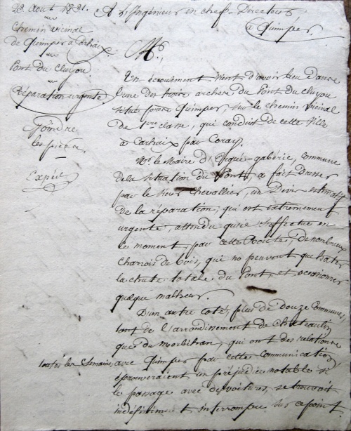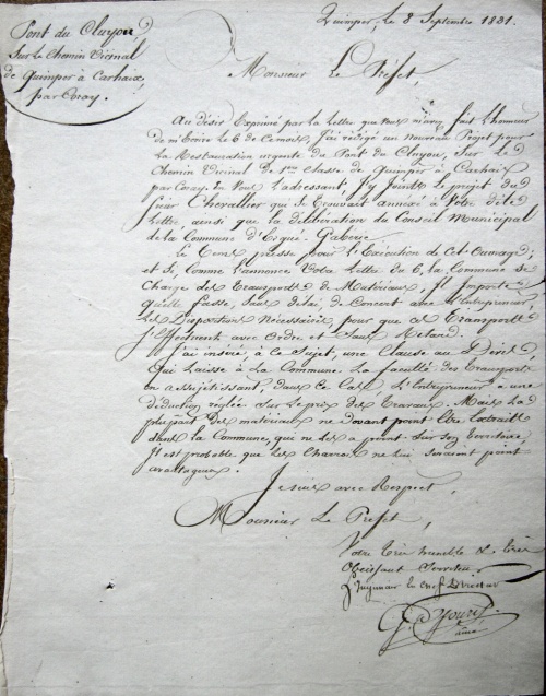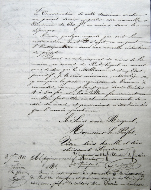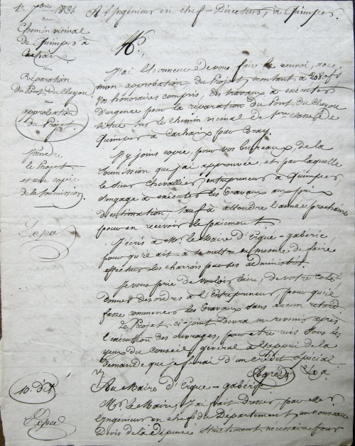 Comme le pont du Cluyou n'est qu'à une très petite distance de Quimper, je verrais avec plaisir que vous voulassiez bien vous transporter surles lieux pour examiner par vous-même l'état du pont, et reconnaitre si la réparation à exécuter ne peut pas se faire avec plus d'économie, et par l'un des moyens qu'indique Mr le maire.