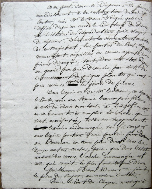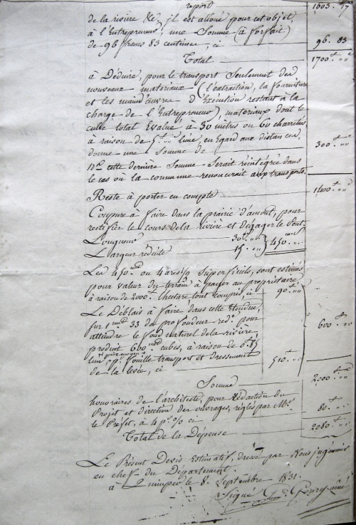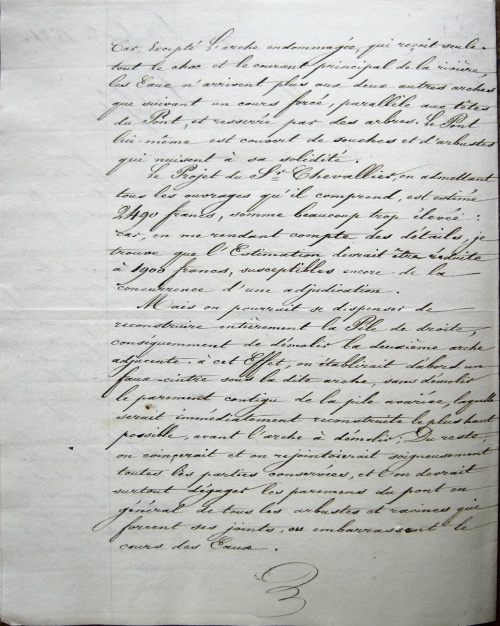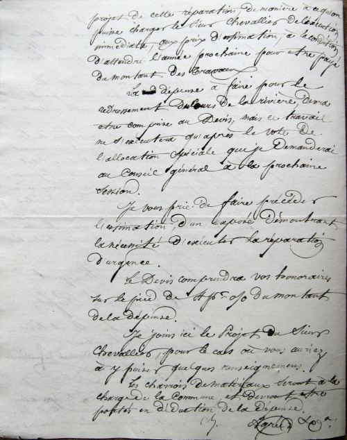 Quant au redressemenr du cours de la rivière, en amont du pont, lequel ne serait sans doute que le rétablissement d'un état primitif, je le crois nécessaire ; cette dépense, y compris la juste acquisition du terrain à (...), ne me parait pas devoir excéder 4 à 500 francs ; les déblais formeraient un remplai fort utile au chemin vicinal, du côté du nord, et pourraient n'être exécuter que l'année prochaine.