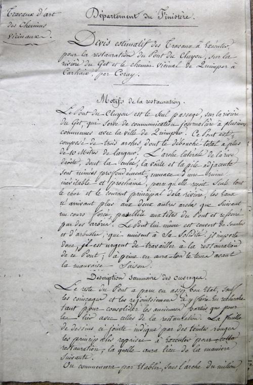 Le Pont du Cleuyou est le seul passage, sur la rivière du Get, qui serve de communication journalière à plusieurs communes avec la ville de Quimper. Ce pont est composé de trois arches, dont le débouché a plus de 10 mètres de largeur. L'arche latérale de la rive droite, dont la culée, la voûte et la pile adjacente sont minées profondément, menace d'une ruine inévitable et prochaine, parce qu'elle reçoit seule tout le choc et le courant principal de la rivière, les eaux n'arrivant plus aux deux autres arches que suivant un cours forcé, parallèle aux têtes du pont et resserré par des arbres. Le pont lui-même est couvert de souches et d'arbustes, qui nuisent à sa solidité. Il importe donc, il est urgent de travailler à la restauration de ce pont ; à peine en aura-t-on le temps avant la mauvaise saison.