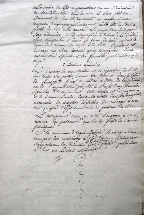 Les travaux de reconstruction et de réparation du pont dans toutes ses parties devant être terminés dans le délai de quarante journées au plûtard, à dater de l'adjudication ou de l'approbation par Mr le Préfet d'une soumission spéciale d'entrepreneur. Cette clause est de rigueur et le soumissionnaire devra la relater dans son engagement, néanmoins ma réception définitive des ouvrages n'aura lieu qu'après l'effet des cries du printemps de 1832.